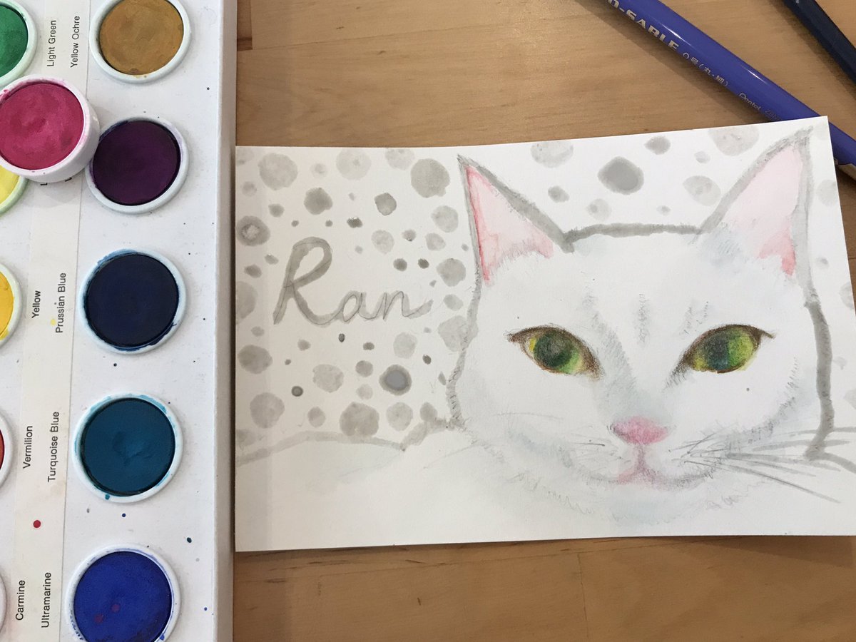 マスキング剥がしてハイライト入れたらこうなりました! マスキング剥がすのめちゃくちゃ楽しい! うちの猫も白猫でした。 22年も生きたおばあちゃん。 白猫ちゃん見ると全部うちの子に見えちゃう。 #ペット似顔絵 #猫好きさんと繋がりたい #アナログ絵 #水彩画 #イラストメイキング