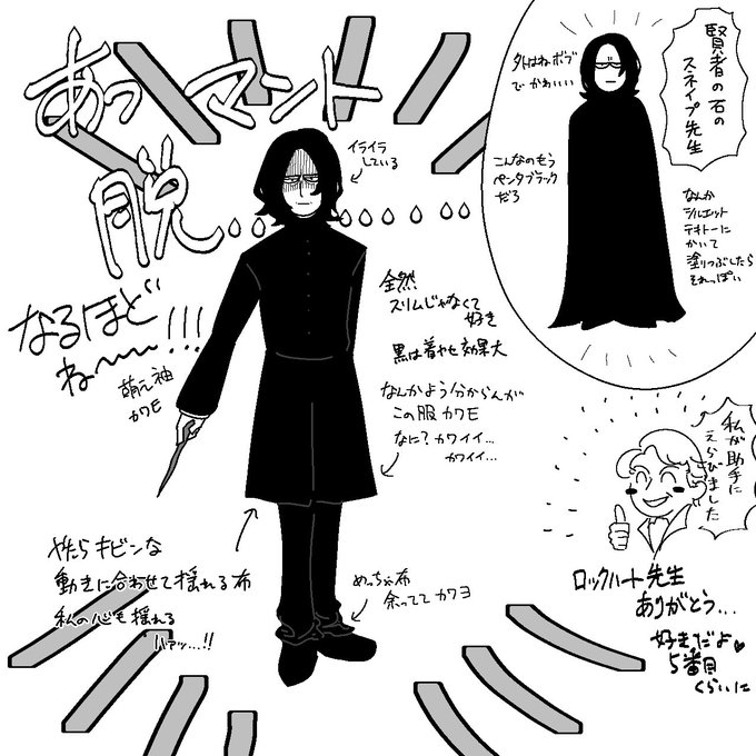 なんか秘密の部屋のスネイプ先生が妙に私の劣情を煽るな〜なんでかな〜と考えてたんだけど決闘のときにマント脱いでたからだ!って気づいた という落書き