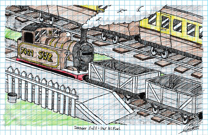 Inktober 2022 - Day 16: Fowl. The LMS Fowler Class 3F, commonly known as "Jinty's" are renowned for their work as shunters. Here we see number 7421, affectionately nicknamed "Brownie" working on the South Western Railway. #Inktober #InktoberFowl #Inktober2022 #Fowl #Jinty