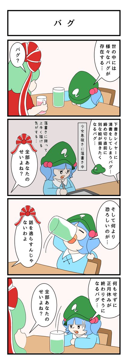 26 114 🥒「明日が仕事なのもバグかな❓🤔」 🎀「現実を見なさいよ…😨」 #鍵山雛 #河城にとり 23/01/03 23:59