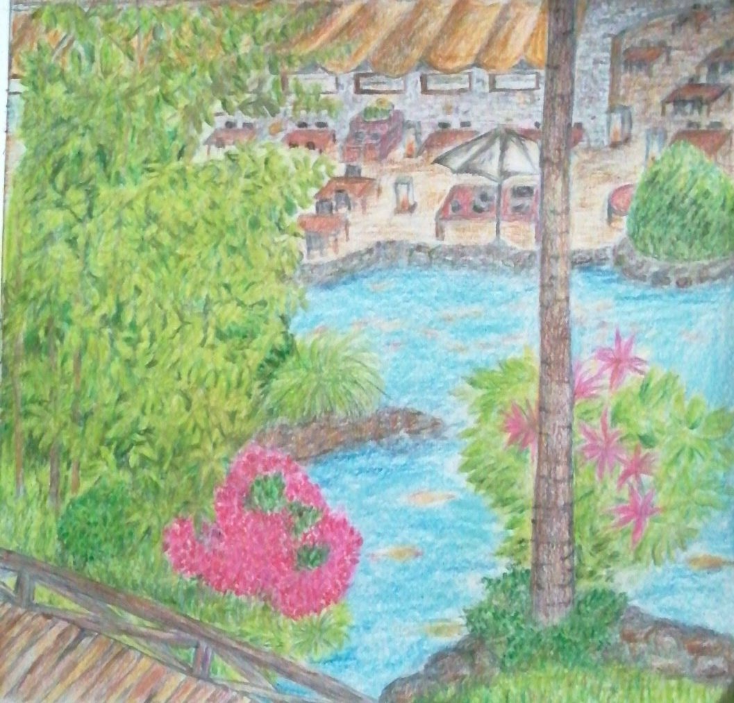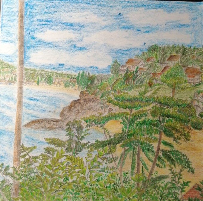 1 49 タイ ランタ島 Pimalai Resort 2008年 バンコクから飛行機でクラビへ 車で港まで移動し、船で海からホテルに到着。自然に囲まれ、海で遊んだり、山を散策もでき、また食事も充実していて最高でした! #色鉛筆画 #たい #ランタ島 #pimalairesort 22/09/25 09:48