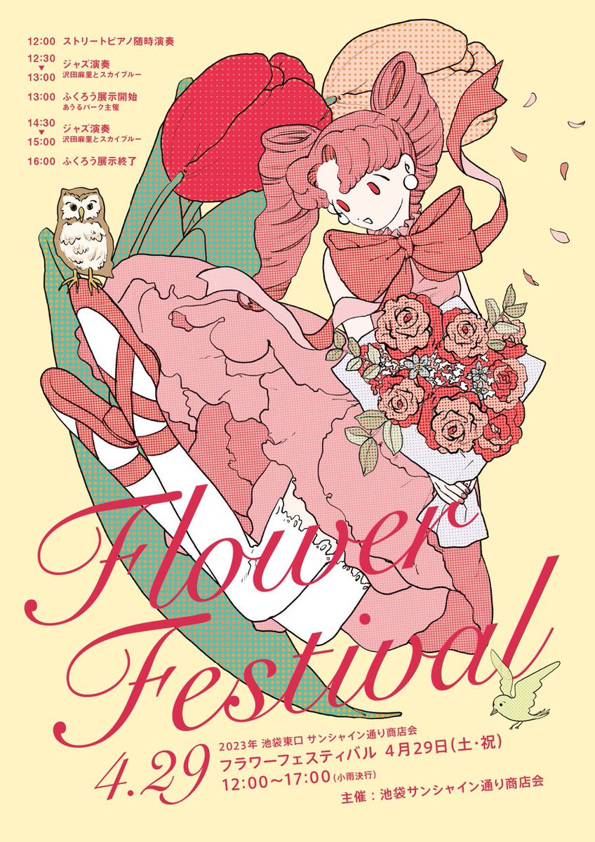 42 558 [work ] 今年も『2023年 池袋東口サンシャイン商店会 フラワーフェスティバル』のイラストレーションを担当いたしました🌷 春らしい素敵なデザインにしていただきました!嬉しい〜。 すでに街にたくさん飾られています! 23/04/15 21:02