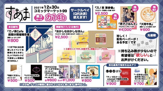 もういくつ寝ると冬コミ〜〜 ということで、こちらにもお品書きをペタリ。 当日はよろしくお願いします。 珍しくペーパーなんかもあります。 #C99 #冬コミ