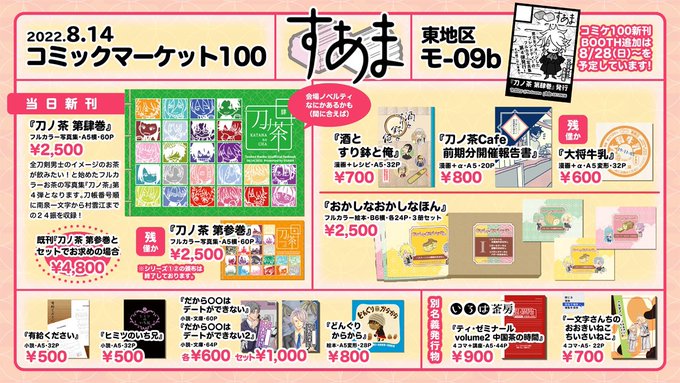 21 19 コミケのお品書きができましたー! 改めてみても、様子がおかしい本しかありませんが、よろしくお願いします。 今発表中の #刀ノ茶 24振まとめたものが新刊となります。 すり鉢とかお菓子もよろしくお願いします。 #コミケ #夏コミ #C100 #刀剣乱舞 #刀ノ茶 #ナツコミ2022 #お品書 22/08/08 22:23