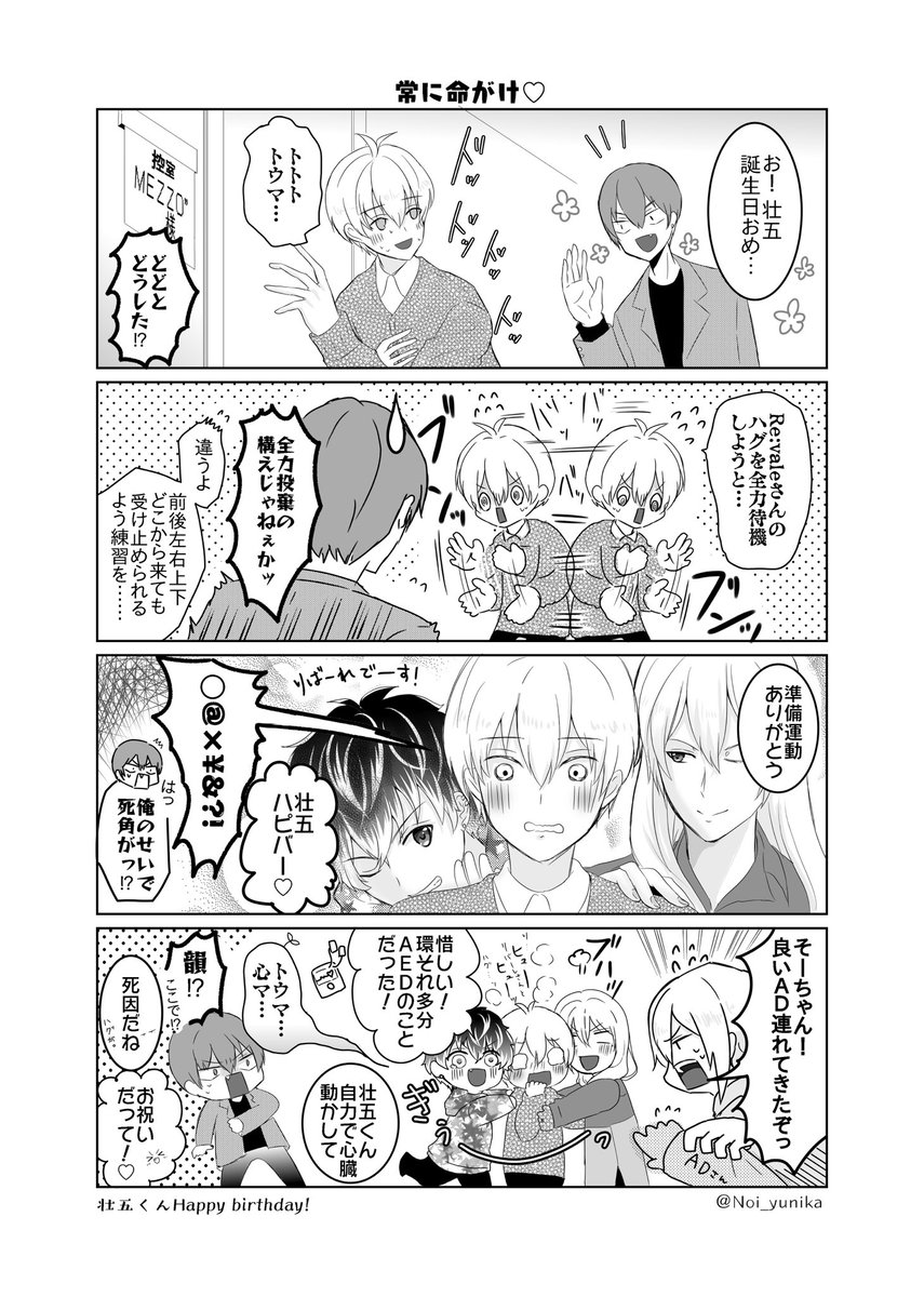 #逢坂壮五生誕祭2023 壮五くん誕生日おめでとう🎉自己実現をしていく君を見ていると、励まされるよ!これからも音楽に夢中でいてね🥰 漫画『常に命がけ♡』 Re:valeさんにハグ予告されちゃったね、そーちゃん!トウマくんともすっかり名前呼び〜🤝 環くん、頑張ってます💮