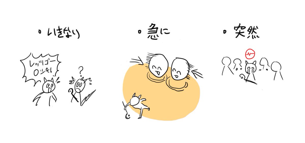 일본어 용법 정리한 유튜브가 있어서 무심결에 보고 있었는데 ‘갑자기’ 라는 말의 종류에 대해 말한게 있길래 적당히 에오르제아식으로 분류해봄