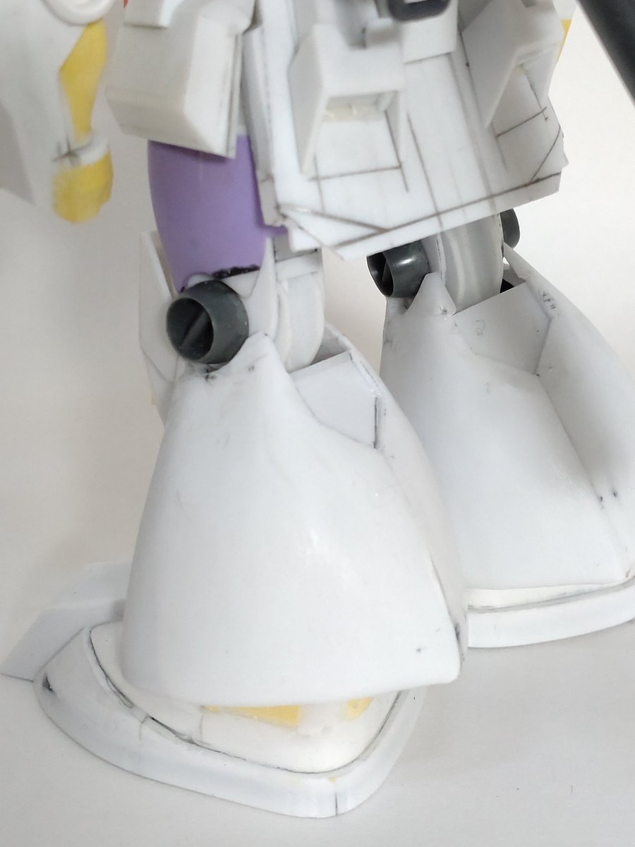 6 30 サンダーボルト版陸戦型ザク進捗。脚部仕上げで脹脛の形に違和感が有ったので見直し。垂れ過ぎていたので修正。サフ無しの写真向って右が修正版。そしてスジ彫り、捨てサフ吹いて確認と修正中。サフ吹くと雰囲気変わってかっこよくなる感じする。 #サンダーボルト #陸戦型ザク #ガンプラ #ガンダム 22/09/10 18:46