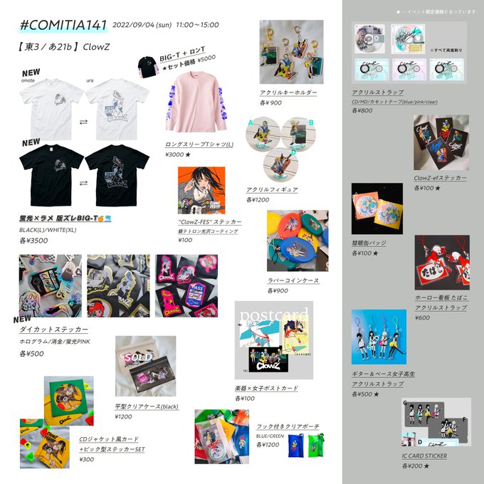 #COMITIA141 お品書き 【東3/あ21b】ClowZ ステッカーとキーホルダーがたくさんあります。新作はTシャツです👕 ギター女子、ベース女子、エフェクター、カセットテープなど音楽モチーフ多めです🎸⚡ ✔各グッズの詳細: instagram.com/clowz_official/ #コミティア141 #コミティアお品書き twitter.com/Non7/status/15…