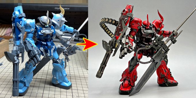 原形無くなるぐらい改造してみた! 左のキットを 右のように改造する動画を 投稿しましたので よろしければご覧ください! youtube.com/watch?v=2sq7PX… #ガンプラ改造