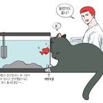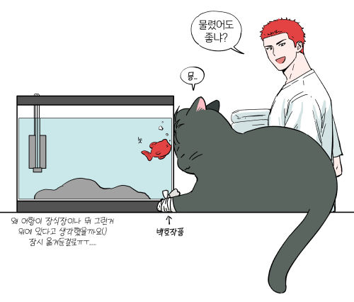 또 참지 못하고 3차 창작을.... 백호 품에 안겨서 백호닮은 금붕어를 빠안히 보는 냥호열이가...보고싶어서..그려버렸어요...체악님 그림...너무 좋아요 짱...ㅠㅠㅠㅠㅠㅜ twitter.com/im_akgae/statu…