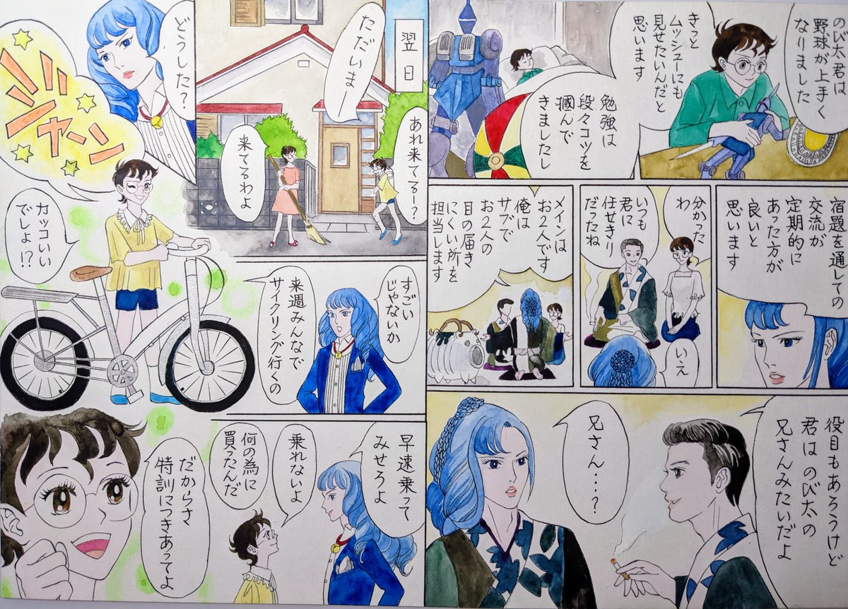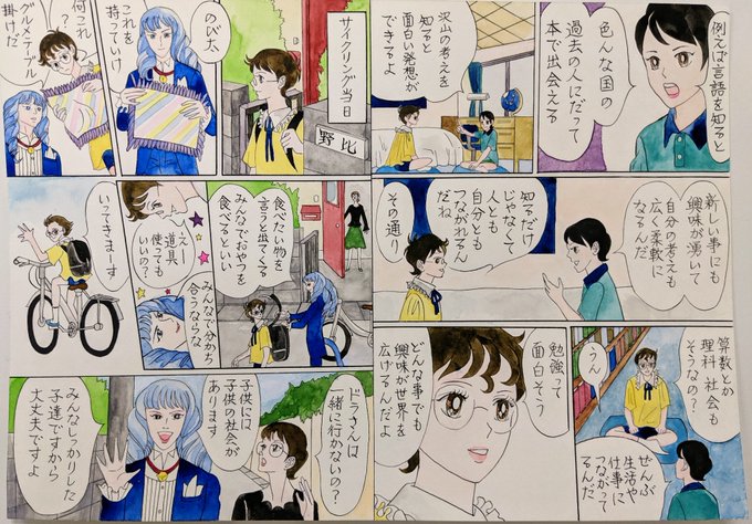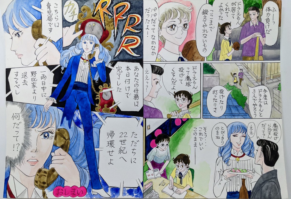ドラは未来の国の育児局から派遣されていて、局に定期連絡しています。仏語入力で「最初は手出しせず見守り。コツを掴んだ所で少しの介助。彼は自力で乗りこなした」。 #絵描きさんと繋がりたい #アトリエの系譜3 #みんなで楽しむTwitter展覧会 #ドラえもん #漫画が読めるハッシュタグ