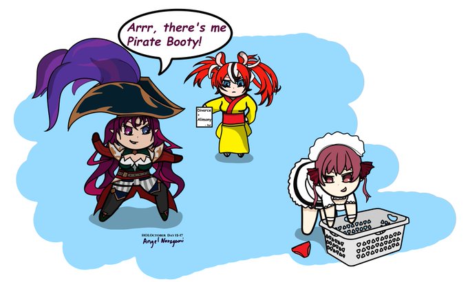Pirate IRyS, Yukata Bae, Maid Marine. #HOLOctober #IRySart #BaelzBrush #マリンのお宝 "Arrr, there's me Pirate Booty!" HOLOctober Day 15-17 chibi scribbles. Took the weekend off, so had to make a triple here.
