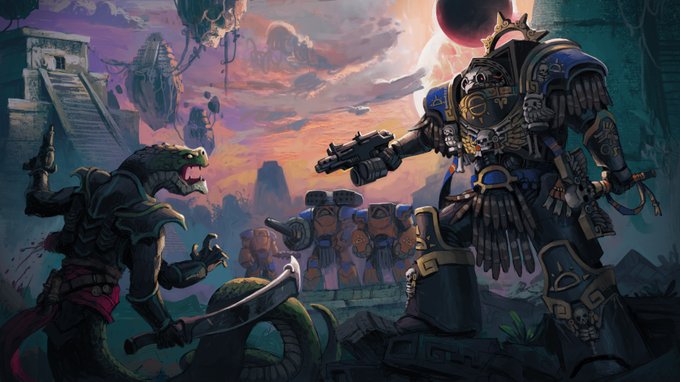 Tecolotl Terminator Chaplain of the Dawn Legion, fighting a Sslyth! A commission I painted for Tlatia. - #WarhammerCommunity #warhammer40000 #WarhammerArt #illustration