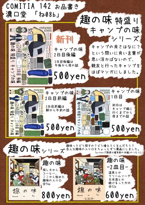 #COMITIA142 #コミティア142 お品書き作りました〜 「趣の味 特盛りキャンプの味」の新刊持っていきます! 11/27ビッグサイト西4ホール ね08bでお待ちしてます! Twitterで火曜更新(していた)本編も持っていきます!