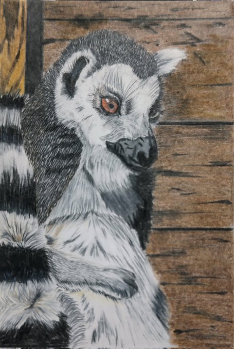 #ワオキツネザル #アナログ画 #色鉛筆 背景も挑戦してみました。 絵を描くのがしんどくなったら休憩も必要かな😀 前の絵より良くなった気がします🤣