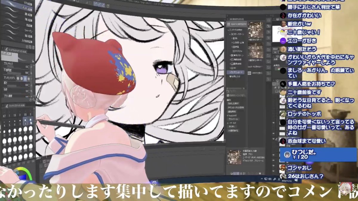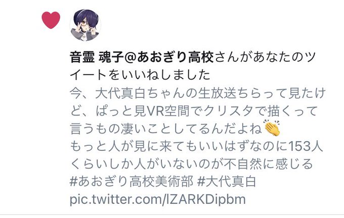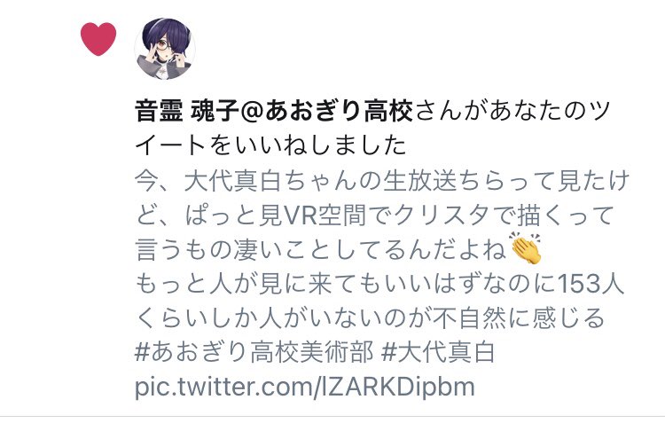 今、大代真白ちゃんの生放送ちらって見たけど、ぱっと見VR空間でクリスタで描くって言うもの凄いことしてるんだよね👏 もっと人が見に来てもいいはずなのに153人くらいしか人がいないのが不自然に感じる #あおぎり高校美術部 #大代真白