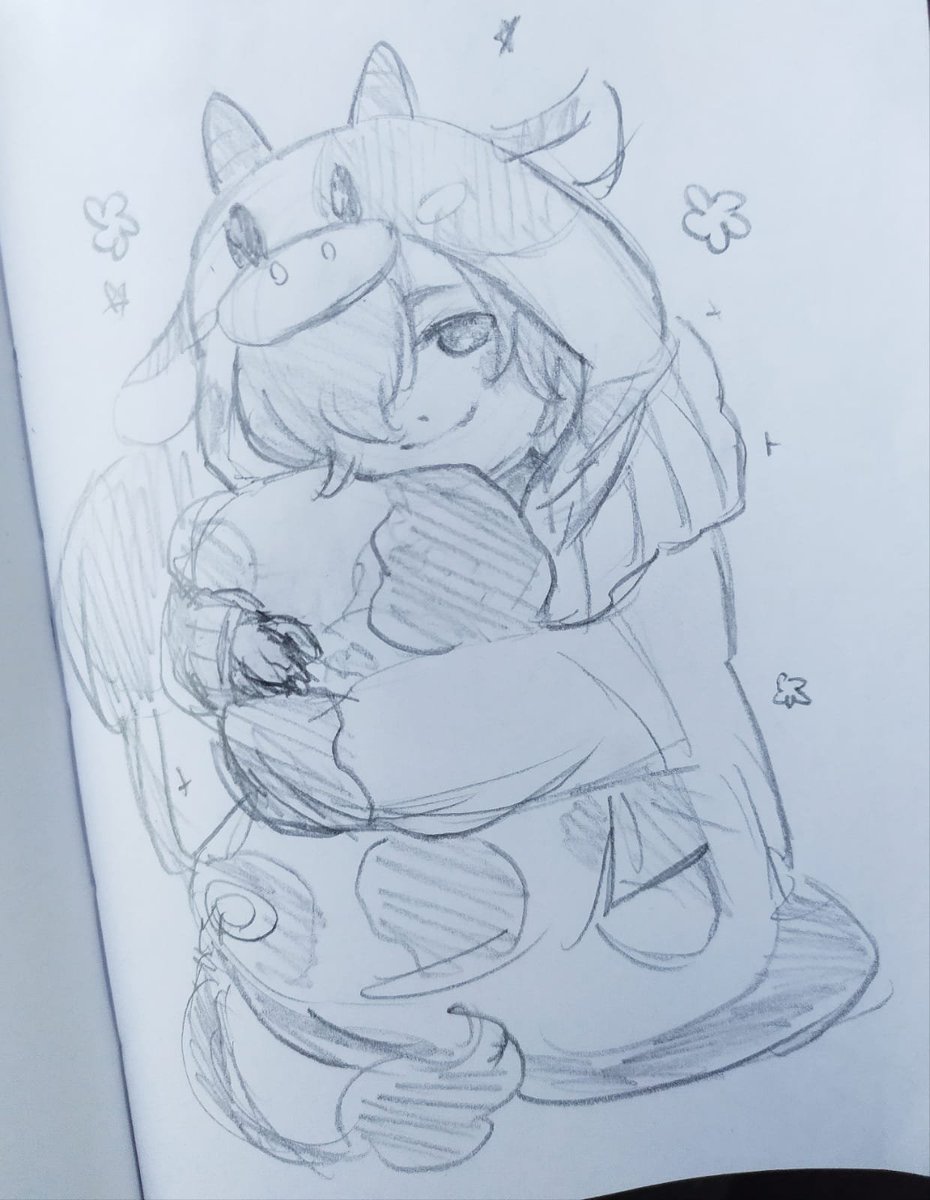 A sketch of Belphie in the cow onesie 🥺💜💜💜🐄 lil cow comfy Belphie is coordinating with his cow pillow I'm ded #obeyme #obeymefanart #obeymebelphegor