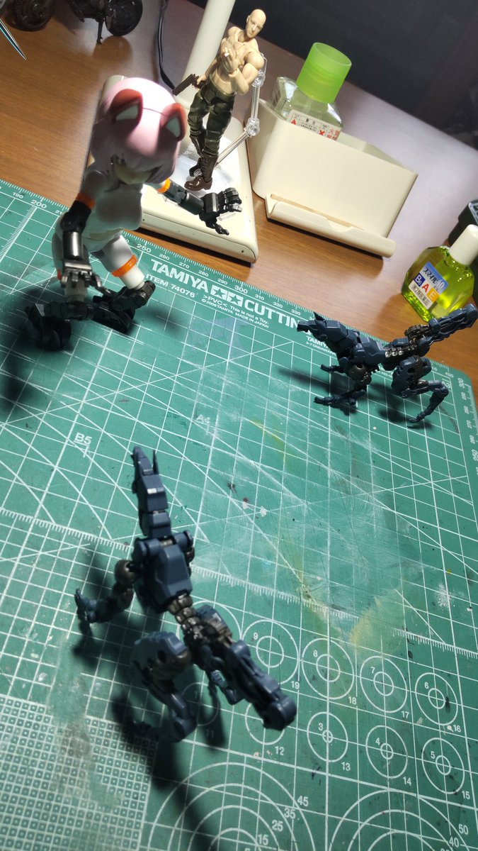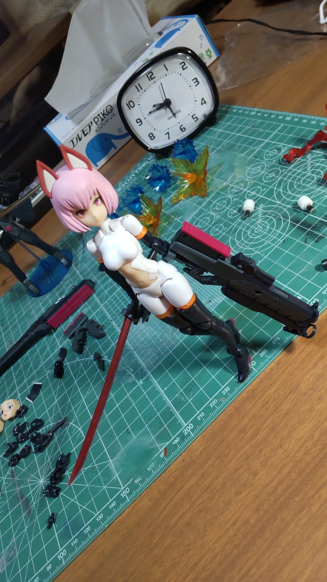 今日はもうフィギュアラック入れられないんで、やっつけでテーブルに飾って眺めながら夜を過ごそうかと思います……… #メガミデバイス