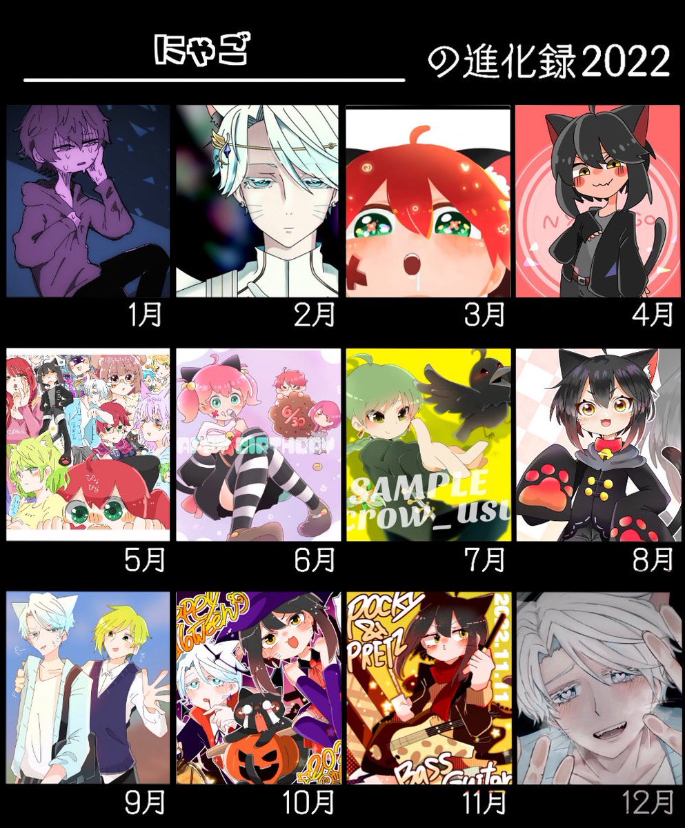 #にゃごの展覧会なのだの🧣🐾 #2022年の絵を振り返る 落描きにまみれたけど今年も沢山描いたのだなー!(7月に至っては有償依頼) これからも、にゃごの絵を好きでいてくれる人がいたら嬉しいです( ˇωˇ ) 引き続き、モチベ上げ共々よろしくお願い致します🙇♂️ テンプレートはMedibang!