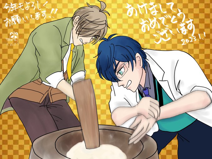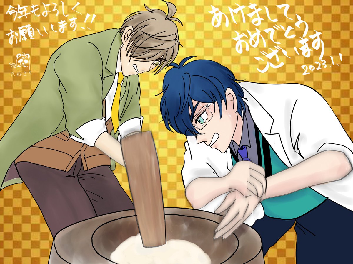 14 60 今年もよろしくお願いします! (ポーズは奈良の早つきで有名な和菓子屋さんのお二人の写真をお借りしました) #絵バンス #まめねことレオス 23/01/01 12:35