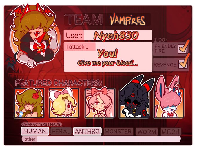 Hey hey! Guess who's trying #artfight2023 ... I am! :> I'm on team Vampire, simply because I love bats! 🦇 I look forward to giving Art Fight a try, it'll be my first time ever! Here's my account! artfight.net/~Nyeh830
