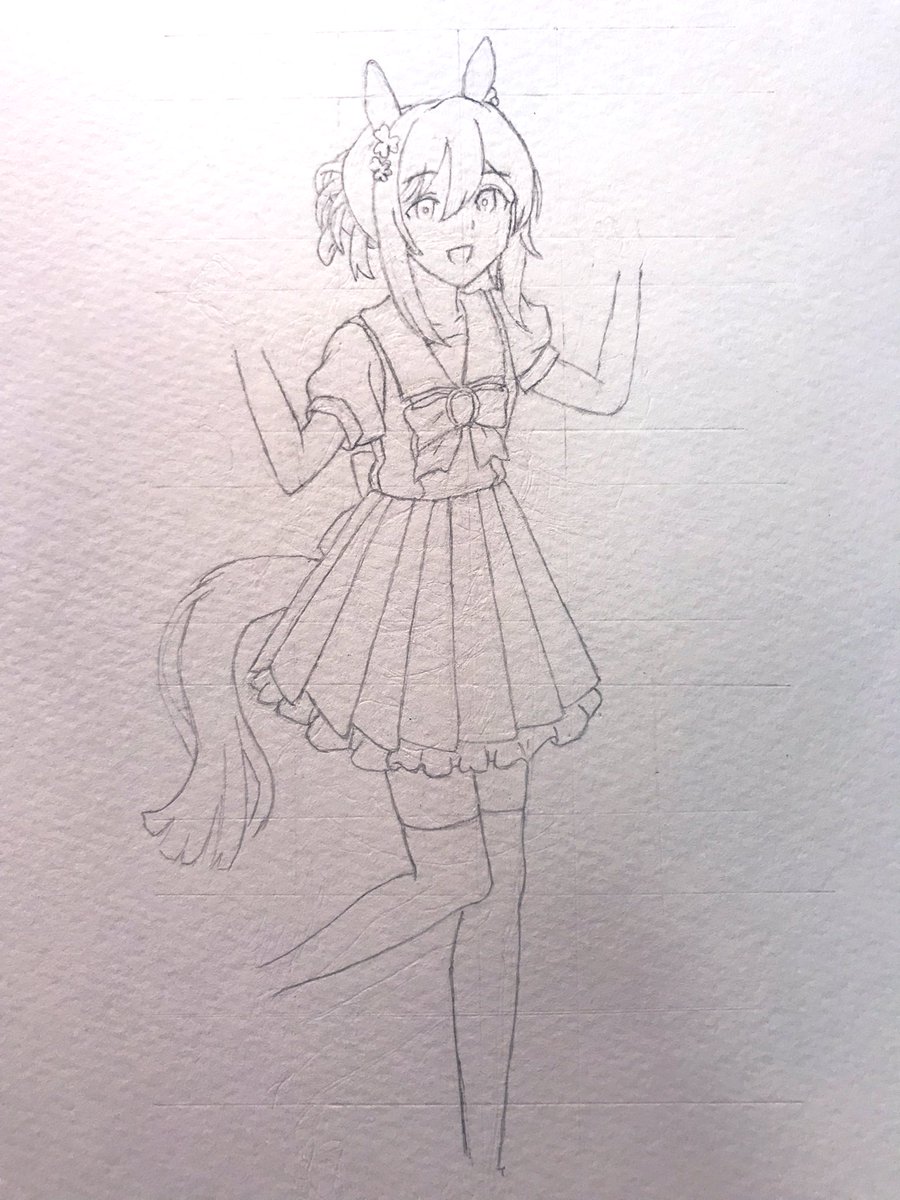 模写の進捗〜 スカートから脚にかけて描いてみたけどプリーツが難しいなぁ... シッポと手足がががが🙃 #アナログイラスト #模写 #ウマ娘 #ファインモーション #絵描きさんと繫がりたい #イラスト好きな人と繋がりたい #イラスト練習