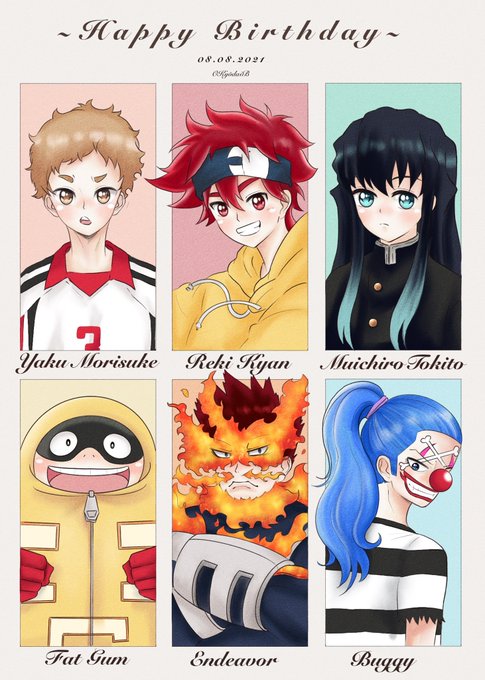 ⭐️08.08.2021🌙 🥳🎉🎂💖✨ “Happy Birthday!! To all of you!” #SixFanarts #SixFanartsChallenge #夜久衛輔誕生祭2021 #喜屋武暦誕生祭2021 #時透無一郎誕生祭2021 #ファットガム誕生祭2021 #エンデヴァー誕生祭2021 #バギー誕生祭2021