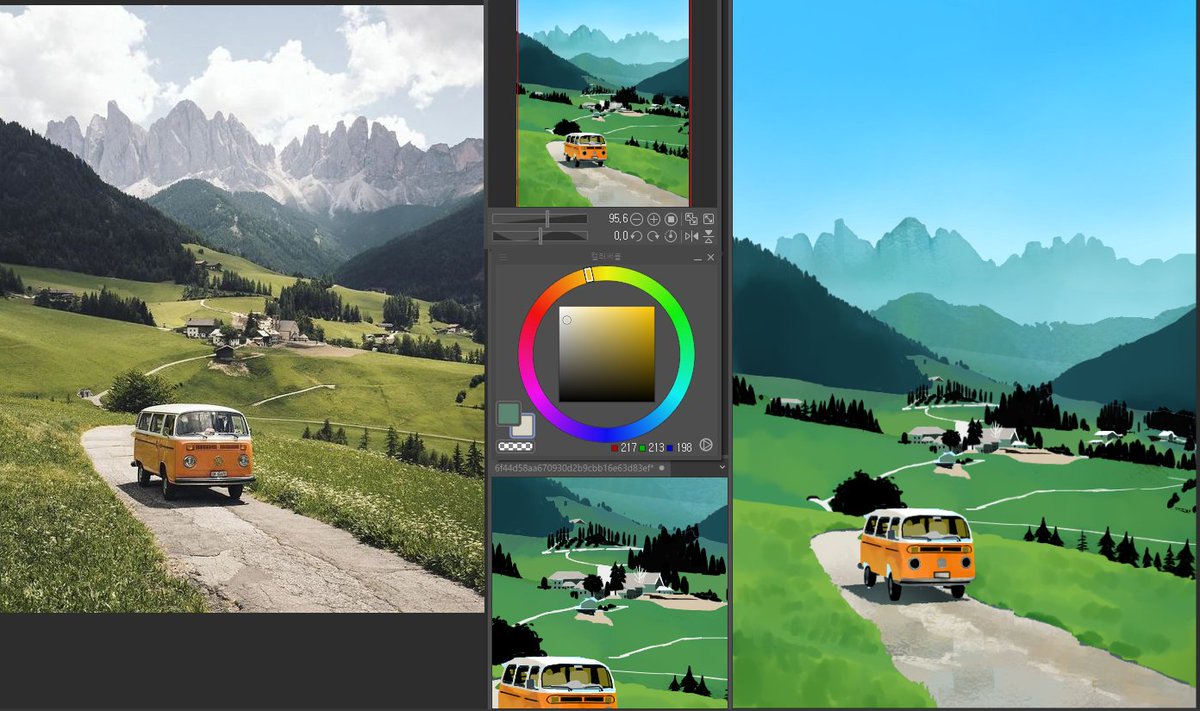 10일 동안 배경 애니풍 채색 츄라이한거 총 6장이지만 다 안들어가니께 'ㅅ'a 3번째 그림 그릴때 막혔던 것 오늘 좀 풀렸다