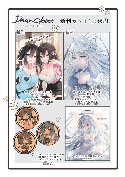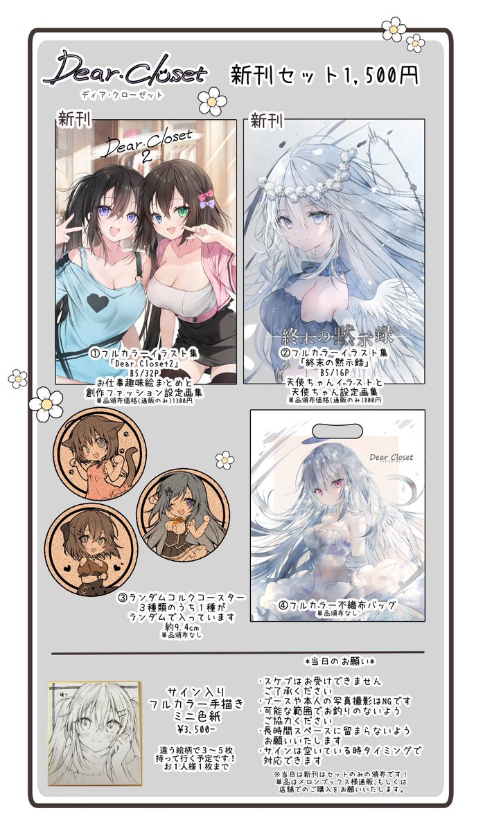 C102のお品書きできました!✨ 当日は新刊はセットのみでの頒布ですが、イラスト集単品は通販でお求め頂けますのでぜひよろしくお願いいたします〜!😊🙏✨ Dear Closet2(創作ファッション、趣味絵仕事絵まとめ本)↓ melonbooks.co.jp/detail/detail.… 終末の黙示録(創作天使イラスト集)↓… twitter.com/i/web/status/1…