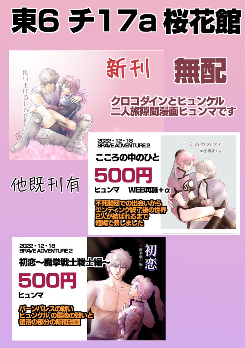 コミケ101お品書き | 桜花越前 #pixiv pixiv.net/artworks/10403… コミックマーケット101 お品書きです 東6チ17a 新刊は24P ヒュンマ 無配となります 今回新刊の通販予定はありません o-ka2000.booth.pm