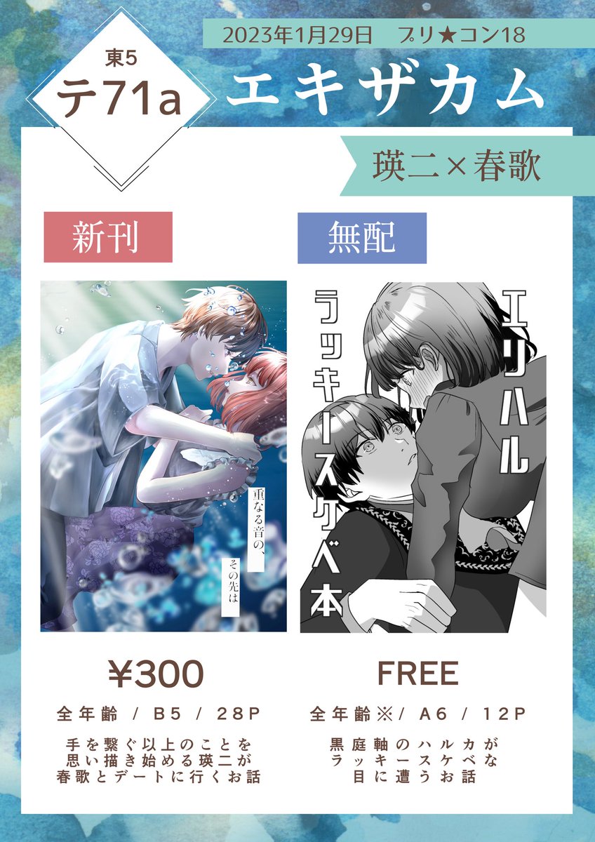 1/29プリコン18の瑛二春の新刊サンプルです!!!📖 「重なる音の、その先は」 B5 / 28P / ¥300 瑛二春の2人がデートに行くだけのお話。 詳細サンプル⤵ pixiv: pixiv.net/artworks/10479… よろしくお願いいたします!💜🌸