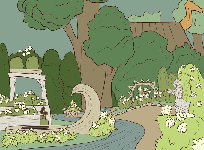 Did some environment design for a change! Despite loving gardens, I have always struggled with drawing them. Guess this is a step forward? #digitalart #ArtistOnTwitter #GardenArt #Flowers #sculpture #River #plants #outside #art #roses #trees #environment #background #medibang