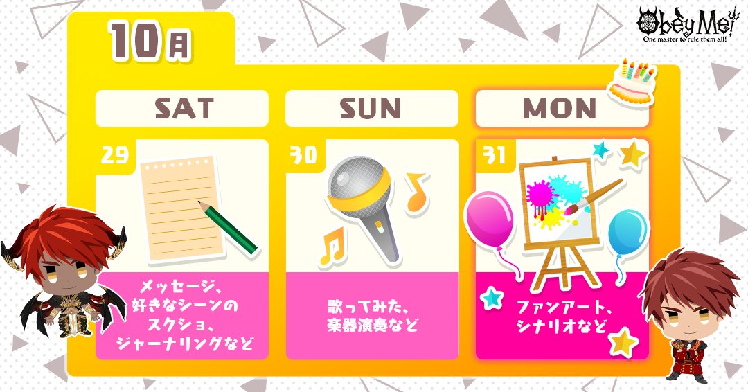来たる10/20にサタンの誕生日をお祝いするため ✨SNSチャレンジ開催✨ 誕生日に向けてサタンにまつわるいろいろな投稿を大募集🌟 もちろん指定日以外での投稿もOK! 書いてあるもの以外にもお祝いの投稿大歓迎です💖 誕生日用のハッシュタグで盛り上がりましょう👍 #ObeyMeBD #HappyBirthdaySatan