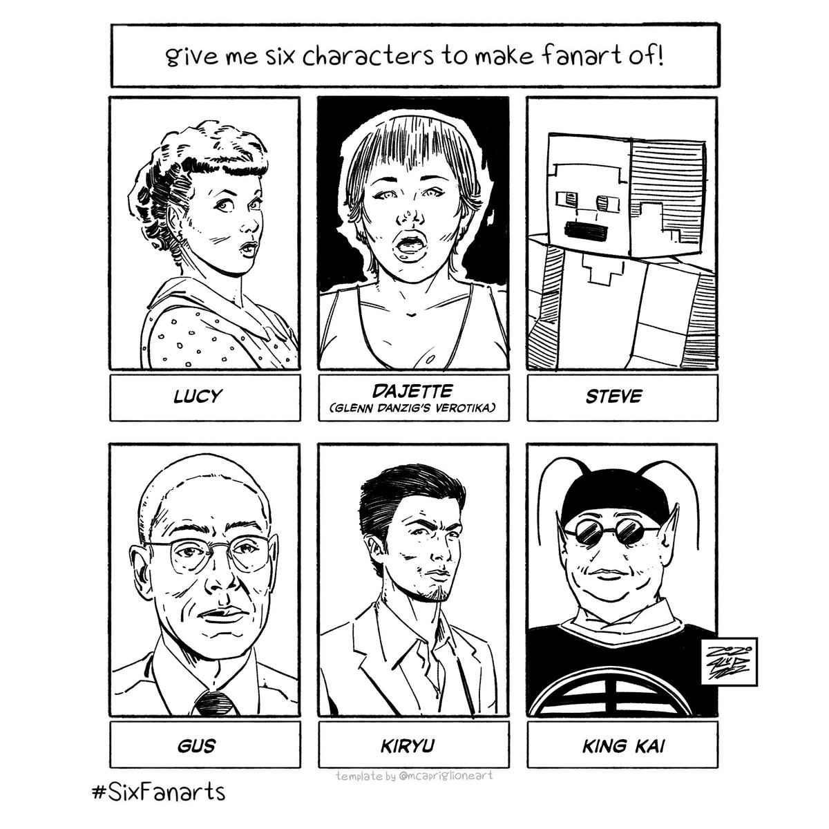 #SixFanarts Vol. 9 - Lucy (I Love Lucy) - Dajette (Danzig's Verotika) - Steve (Minecraft) - Gus Fring (Breaking Bad) - Kiryu (Yakuza) - King Kai (Dragon Ball)