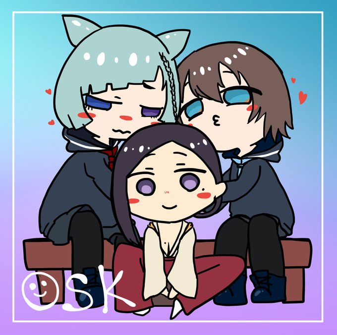 ずっと三人いっしょなのだ。 🔻描いたメンバー 九ツ儡しゃち #しゃちアート 神楽桃 #桃へのお供え物 餅塚御茶丸 #昼茶丸 ※素材は下記からお借りいたしました。 twitter.com/gentei_sozai/s…