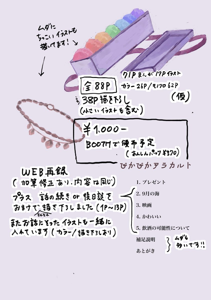 21 91 5/14 エアコレ頒布予定 『ぴかぴかアラカルト』 A5/88P/1,000円(仮) WEB再録+描き下ろし(内38P) 設楽×バンビの 漫画&イラスト本です。 希望の方いましたら部数アンケ お願いいたします🙇♀️月曜くらいに締めます。(ツリー最後)1/3 23/04/22 13:41