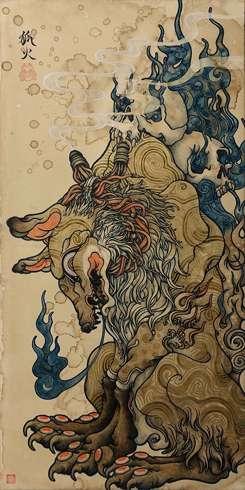 4年前に描いた「狐火」はお気に入りの絵なので今回の絵の顔に起用した。