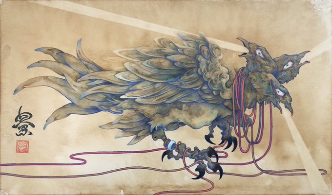 鵸鵌・(きよ) 山海経-西山経- 翼望之山、有鸟焉、其状如乌、三首六尾而善笑、名曰鵸鵌、食之不魇、又可御凶。 翼望山には鳥がいて、その形は烏のようで、三つの首六つの尾でよく笑う、名は鵸鵌という、食すと夢にうなされず、また凶事を防ぐことができる。
