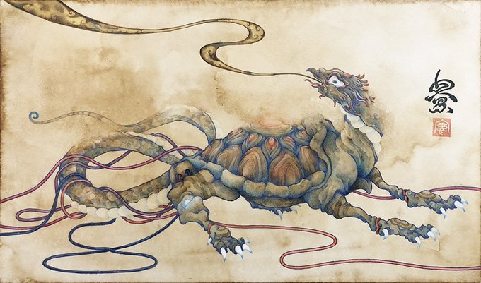 旋亀(せんき) 山海経-南山経- 其中多玄龟,其状如龟而鳥首虺尾,其名曰旋龟,其音如判木,佩之不聾,可以為底。 水中には黒い亀が多く、その形は亀のようで鳥の頭・蛇の尾、その名は旋亀、その声は木を裂くよう、これを持ち歩くと聾にならず、手足にできたタコを治すのによい。