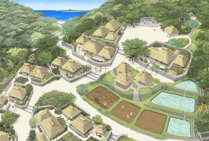32 156 【お仕事情報】海洋博公園「おきなわ郷土村」今年4月以降のリニューアルに伴い、園内解説板のイラスト大小9点を描かせていただきました。こちらはA2サイズの古琉球(12〜16世紀頃)の集落イメージイラスト(時代考証チェックは高良倉吉先生)です。住民と動物をたくさん描きました。詳細↓ 22/02/08 10:57