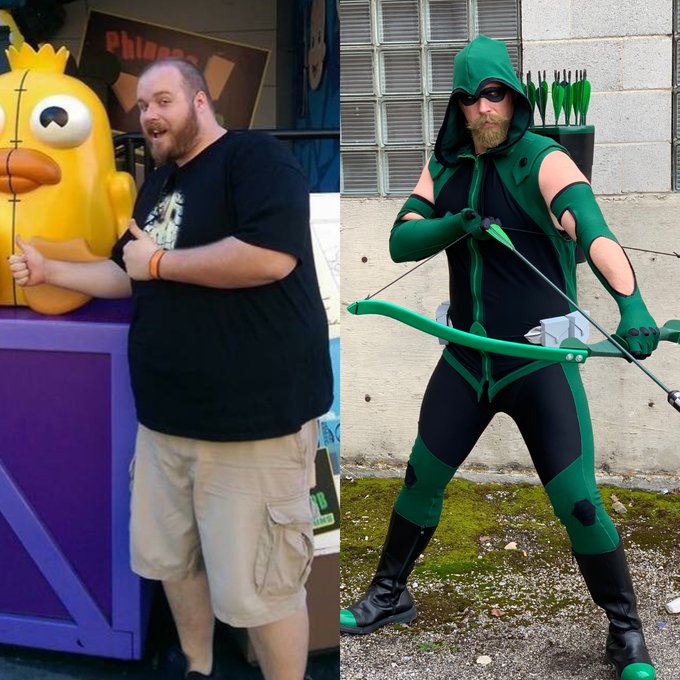 #TransformationTuesday from 417lbs to 250! My love for #Cosplay & rocking the #EmeralArcher has really helped me along my journey!