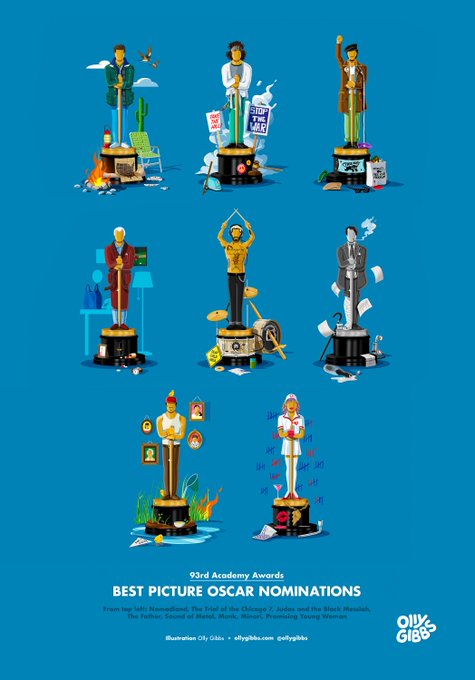 With the imminent announcement tomorrow of the 2022 @TheAcademy #Oscars nominations here are my illustrations from the past 3 years of the Best Picture category. This has been an ongoing personal project of mine which I've created since 2014. See more: ollygibbs.com