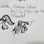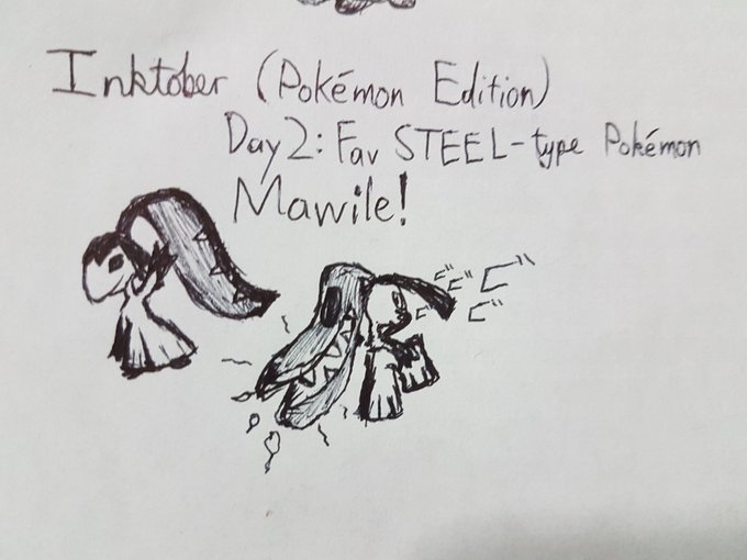 Here's the Pokémon version of #inktoberday2! #inktober#Inktober2019#inktober2019day2 Prompt: fav Steel-type Pokémon. Mine is Mawile! Anyone who's seen my phone case shouldn't be surprised. <3 I also threw in an old Mawile sketchbook page I forgot I had lying around. (2/2)