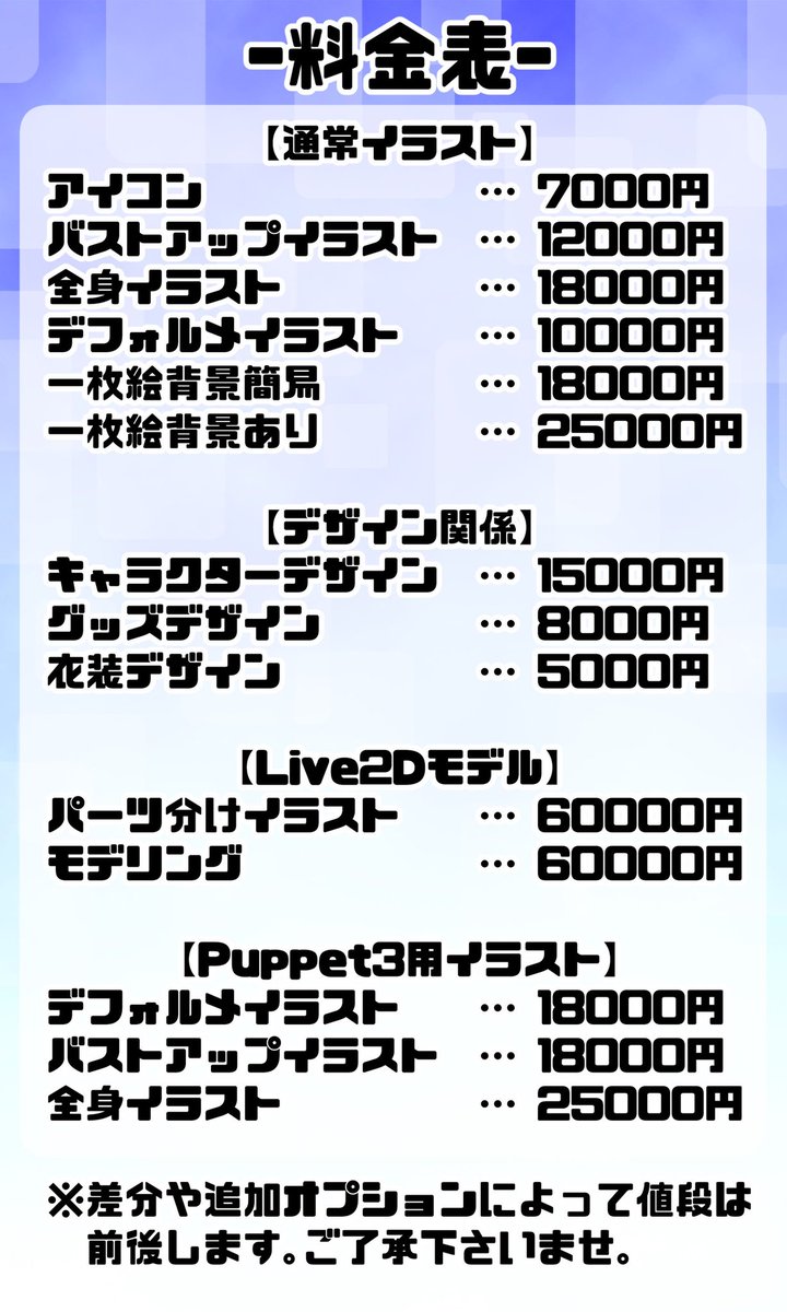 【お仕事募集】 イラスト・Live2Dモデリングのご依頼募集しております! 直接のご依頼はDMまで! お仕事実績はプロフ参照! サンプルや料金は画像参照願います! 作品一覧 twitter.com/i/moments/1342… skeb skeb.jp/@Omochi_nekonui SKIMA skima.jp/profile?id=925… ココナラ coconala.com/users/2112701
