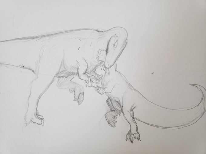 Kinda got bored so I drew this in my sketchbook Warmup sketch of Acrocanthosaurus catching a Tenontosaurus Part of my new years resolution is making more paleoart so expect more in the future! #Paleoart#sketch