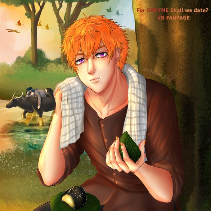 "Do you want to eat some with me?" I let Beel dress up like a farmer in my grandfather's hometown - Cà Mau (Việt Nam). Looks like Belphie is tired over there... Just let him sleep more 🤫 #obeymebeelzebub #obeymebelphegor #obeymefanart #obeymeshallwedate #Vietnam
