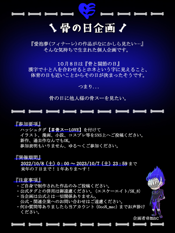 【💙お知らせ💙】 10月8日は「骨の日」という事で企画やります! 1年企画です!皆さま焦らずゆる~くご参加頂けると嬉しいです❣😊 詳細は画像をご参照をば…よろしくお願い致します!! #骨スーLOVE