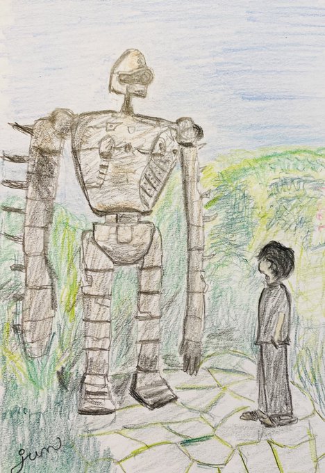 ゆるっと落書き風🌿 デカい 描いてみました 距離感、近っ😎 #米津玄師 #デカい #ロボット兵 #鉛筆画 #色鉛筆画 #模写イラスト