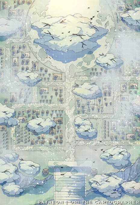 Visit the skies with the High Court of Winds battlemap pack! This map pack contains 10 different map variations, both in grid and gridless versions. The maps are set on 24x42 grid and variations include day, night and others. #dndart #ttrpg #battlemaps