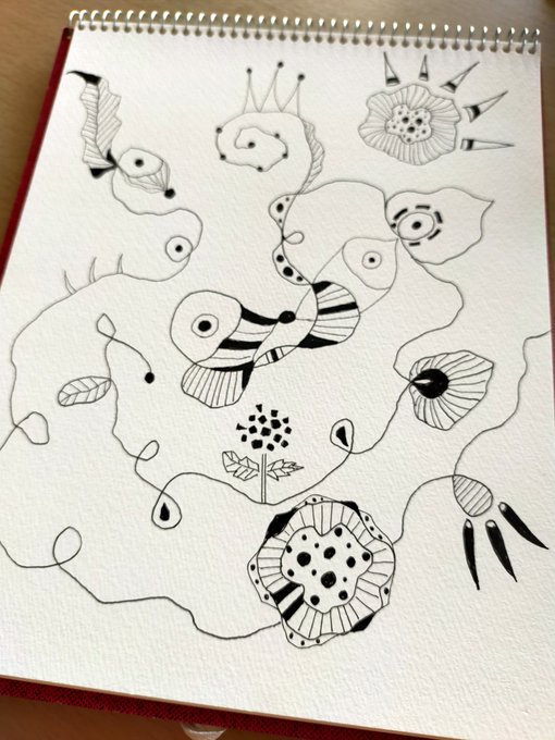 1 7 title「繋がり行く花と夢」が完成しました。春っぽい作品。どうぞ宜しくお願い致します。今日も鹿児島は晴れ。朝は寒さ厳しかったですが、ポカポカ日和となりそうです!良き一日を〜🌸#ペン画 #花の絵 #デザイン #抽象画 #画家 23/02/16 11:15